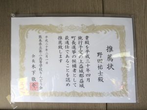 2018年02月01日( 木 ) 第二高等学校りんどう会様より推薦状をいただきました! 熊本県立第二高等学校りんどう会、木下会長より益城町長選挙の候補者として最適任であると推薦状を頂きました。 益城町のために頑張って参ります。 続きを読む